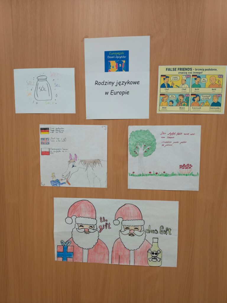 W ubiegłym tygodniu świętowaliśmy w naszej szkole (jak mamy to w zwyczaju każdego roku) Europejski Dzień Języków (26.09). Z tej okazji na lekcjach języka niemieckiego przez cały tydzień realizowane były zajęcia dotyczące rodzin językowych (np. słowiańskie, germańskie, romańskie). Uczniowie chętnie włączali się w dyskusję, m.in. o pokrewieństwie poszczególnych języków oraz wynikających z niego podobieństwach między znanymi im językami. Poruszyliśmy także kwestię tzw. “fałszywych przyjaciół” (pary słów w różnych językach, które brzmią lub wyglądają podobnie, ale mają zupełnie inne znaczenie, tworząc pułapki językowe dla uczących się), co pozwoliło przyjrzeć się językom zarówno analitycznie, jak i z poczuciem humoru. W ramach podsumowania uczniowie wykonali plakaty przedstawiające wybrane podobieństwa lub różnice w słownictwie poszczególnych języków, które można podziwiać w obu budynkach szkolnych, a także w poniższej galerii zdjęć.